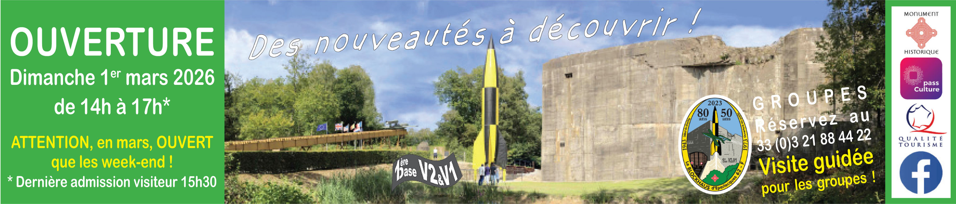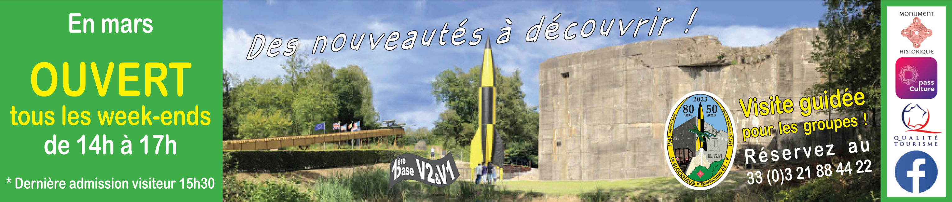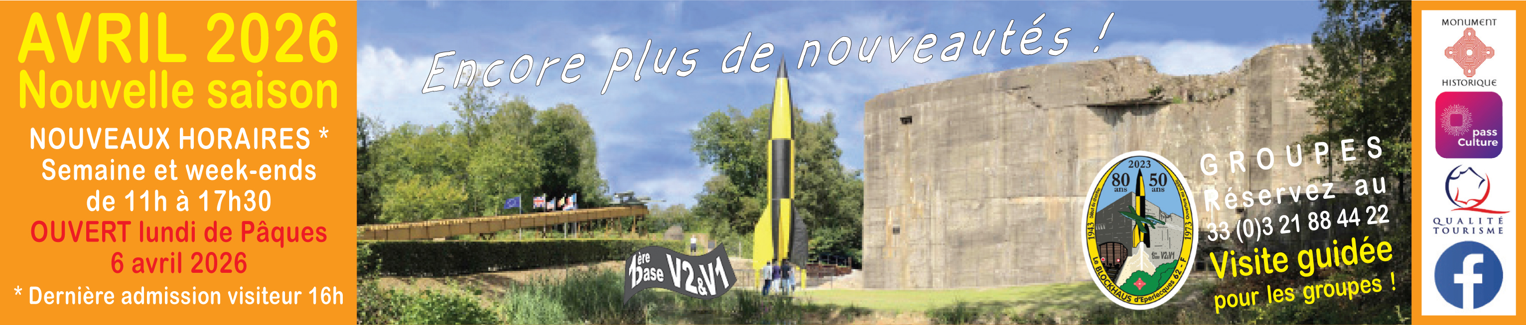 1h30 de visite, pour découvrir, connaître l’histoire du Blockhaus d’Eperlecques, la technologie des armes secrètes V2 & V1, dans un parc boisé. Vous serez impressionné, intéressé et garderez un souvenir inoubliable !